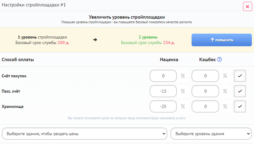 Чтобы повысить уровень строительной площадки, нажмите кнопку "Повысить уровень":