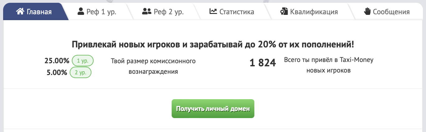 Вы будете получать до 25% от рефералов 1 уровня и до 5% от рефералов 2 уровня. Средства зачисляются равными суммами на пассажирский счет, счет вывода и жетоны. Таким образом, вы сможете зарабатывать вообще без вложений!