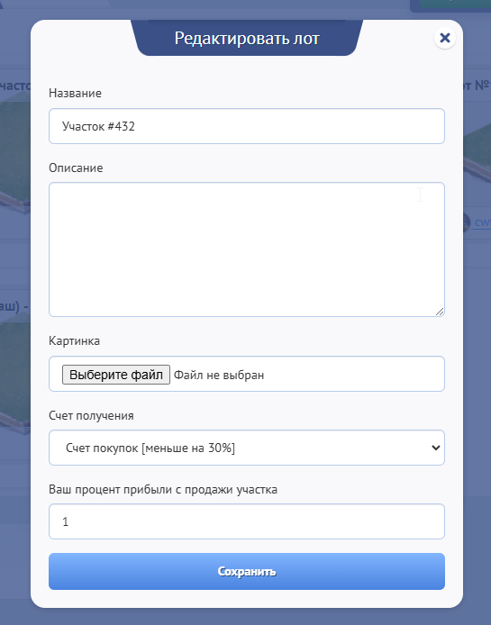 Изменить название участка, добавить описание, добавить картинку лота, выбрать один из счетов: покупок(Вы получите меньше на 30%), пассажирский(Вы получите меньше на 30%), вывода. А также процент прибыли с продажи участка, здесь важно подметить, что Вы можете только уменьшать процент с прибыли.