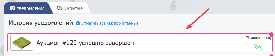 После победы на аукционе, Вы увидите уведомление о его окончание и принадлежащим Вам участке.Он будет показан в Ваших Владениях.